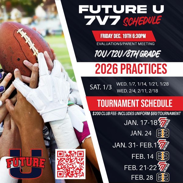 Future U Football is a football club based out of Tempe, AZ and surrounding cities. Future U Football was created to bridge the gap between youth and high school football and prepare young athletes for that transition. We compete in both 7v7 and Tackle Football. All of our coaching staff has a minimum of high school level coaching experience and some with college/professional level experience- both playing and coaching.